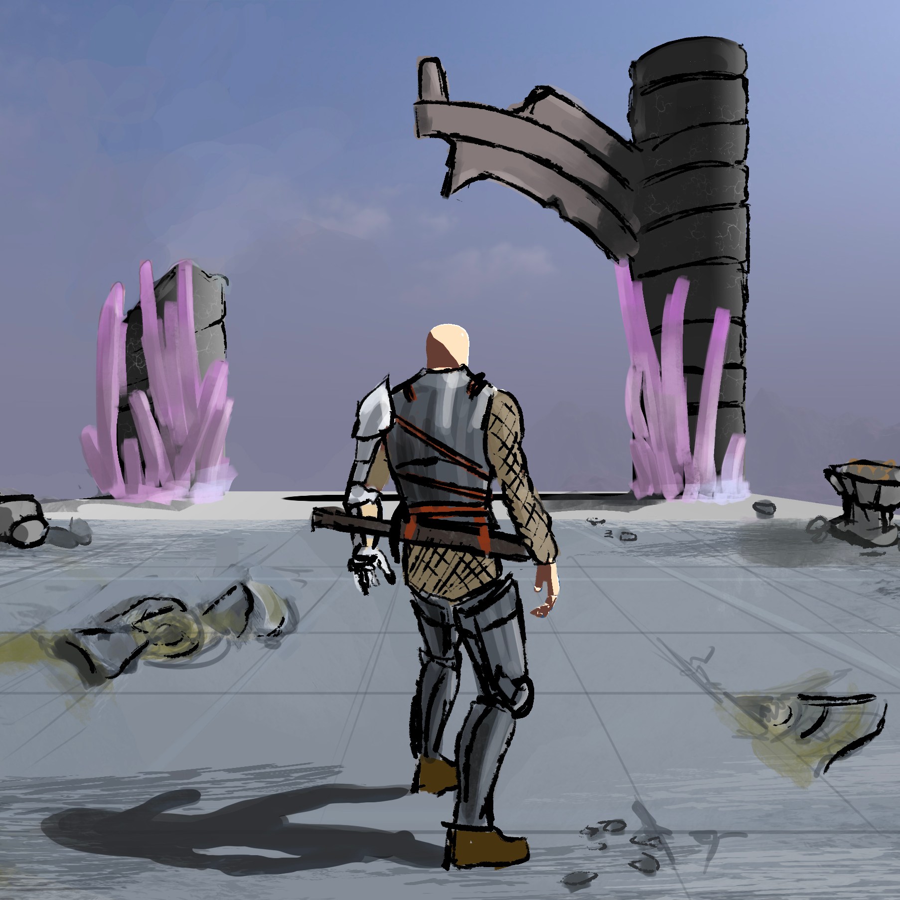 Art is the answer. The goal os to have a vertical slice done by the end of the semester, which is in two weeks. That means that I need a fully rendered, playable, and enjoyable area of my game. The area I chose is the area the player starts in, which is the Ancient Grounds.